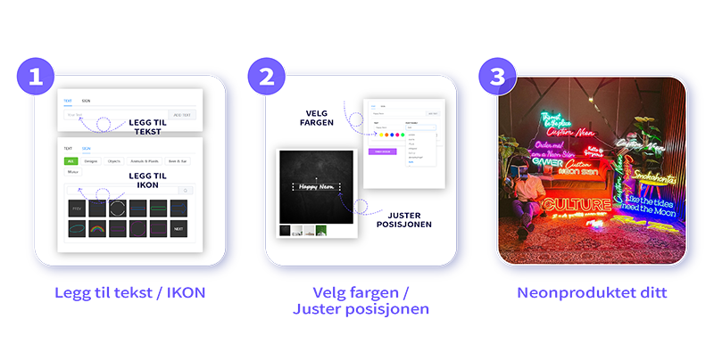 Design ditt egendefinerte neonskilt online på bare noen få minutter! Legg til tekst og logo til ditt egentilpassede neonskilt med vårt enkel-i-bruk nettbaserte verktøy. Lag enkelt et kunststykke som reflekterer din stil og personlighet. Start din neon-skilteventyr i dag!